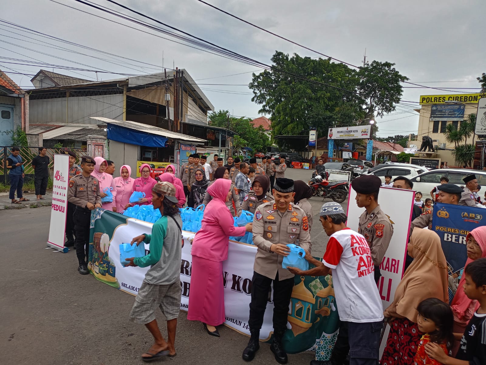 Kapolres Cirebon Kota, Eko Iskandar, memimpin langsung pembagian takjil. Ia didampingi Ketua Cabang Bhayangkari Cirebon Kota Ny. Mayya Eko Iskandar bersama jajaran pejabat utama Polres, pengurus Bhayangkari, serta anggota komunitas internal kepolisian.
